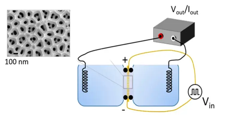 Устройство состоит из пористой мембраны с нанесенными с обеих сторон ультратонкими металлическими слоями. При подаче низкого электрического напряжения в импульсном режиме металлические поверхности проходят циклы зарядки и разрядки. Возникающий при этом небольшой дисбаланс формирует направленный поток ионов через мембрану. Принцип действия основан на так называемом храповом механизме в нанопористых структурах — физическом эффекте, который впервые был применен для транспортировки ионов в жидкости.