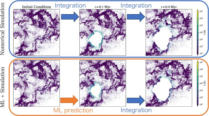 - Основные узлы. Огромное число процессоров (в экспериментах на суперкомпьютере Fugaku их было почти 150 тысяч), которая занимается симуляцией гравитации и движения газа в масштабах всей галактики. Они работают с большим, эффективным шагом по времени — например, 2000 лет.