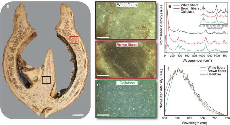 В ходе исследования специалисты Лаборатории интеллектуальных материалов при Центре интеллектуальных инженерных материалов в течение пяти лет анализировали образцы с помощью 3D-визуализации, механических испытаний, а также методов комбинационного рассеяния и флуоресцентной спектроскопии. Оптическая микроскопия показала различия между коричневыми и белыми волокнами, из которых состоит орех, и подтвердила неоднородность его химического состава. Основным компонентом материала является целлюлоза.