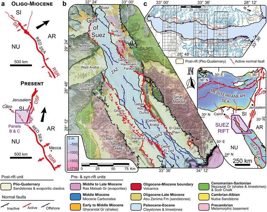 Традиционная модель эволюции Суэцкого рифта выглядит так: активная фаза шла в олигоцене и миоцене, затем произошла реорганизация плит, и активность сместилась в залив Акаба. Суэцкому заливу осталась лишь фаза термального проседания — пассивного опускания дна по мере остывания литосферы.