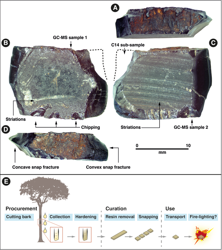 Особый интерес представляет обнаруженный в пещере артефакт — прямоугольный кусок древесной смолы. Его форма и следы обработки свидетельствуют о целенаправленном сборе смолы с деревьев и ее дальнейшем использовании, возможно, в качестве клея, топлива или для изготовления орудий. Этот артефакт является не только древнейшим свидетельством использования древесной смолы человеком за пределами Африки, но и говорит о достаточно сложных технологических навыках, которыми обладали жители Мололо.