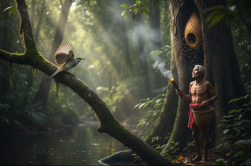 Птица-медоуказчик, обитающая в Африке, сама не может добраться до ульев, чтобы полакомиться мёдом. Но она очень умна: она находит улей и затем ведёт человека к нему. Она щебечет и летает особым образом, привлекая внимание. Когда человек находит улей и выкуривает пчёл, он забирает мёд, а птица в награду получает остатки воска, который ей нужен для питания. Этот удивительный союз помогает обоим видам: птица получает еду, а человек — источник сладкого лакомства.
