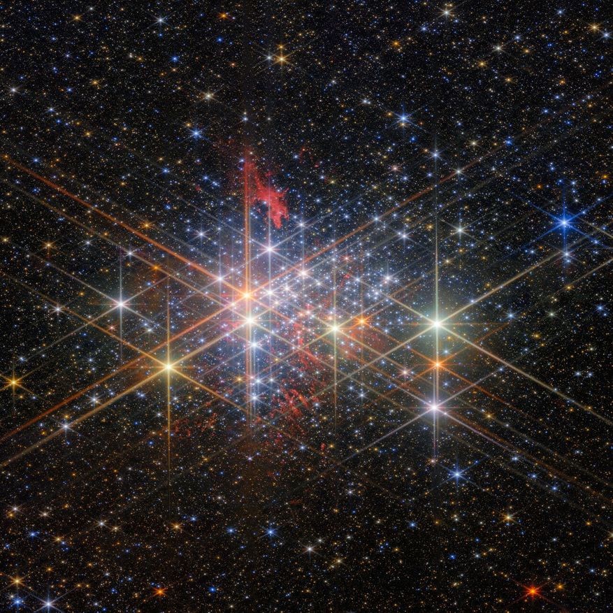 Изображение Westerlund 1, представленное телескопом «Джеймс Уэбб» (JWST), стало «Фото Месяца». Только JWST способен запечатлеть эту «звёздную фабрику», оптические телескопы не способы проникнуть через облака газа и пыли, расположенные в межзвёздном пространстве. Инфракрасный прибор NIRCam на JWST «видит» сквозь помехи, улавливая свет в инфракрасных диапазонах, не рассеиваемых этой галактической «грязью».