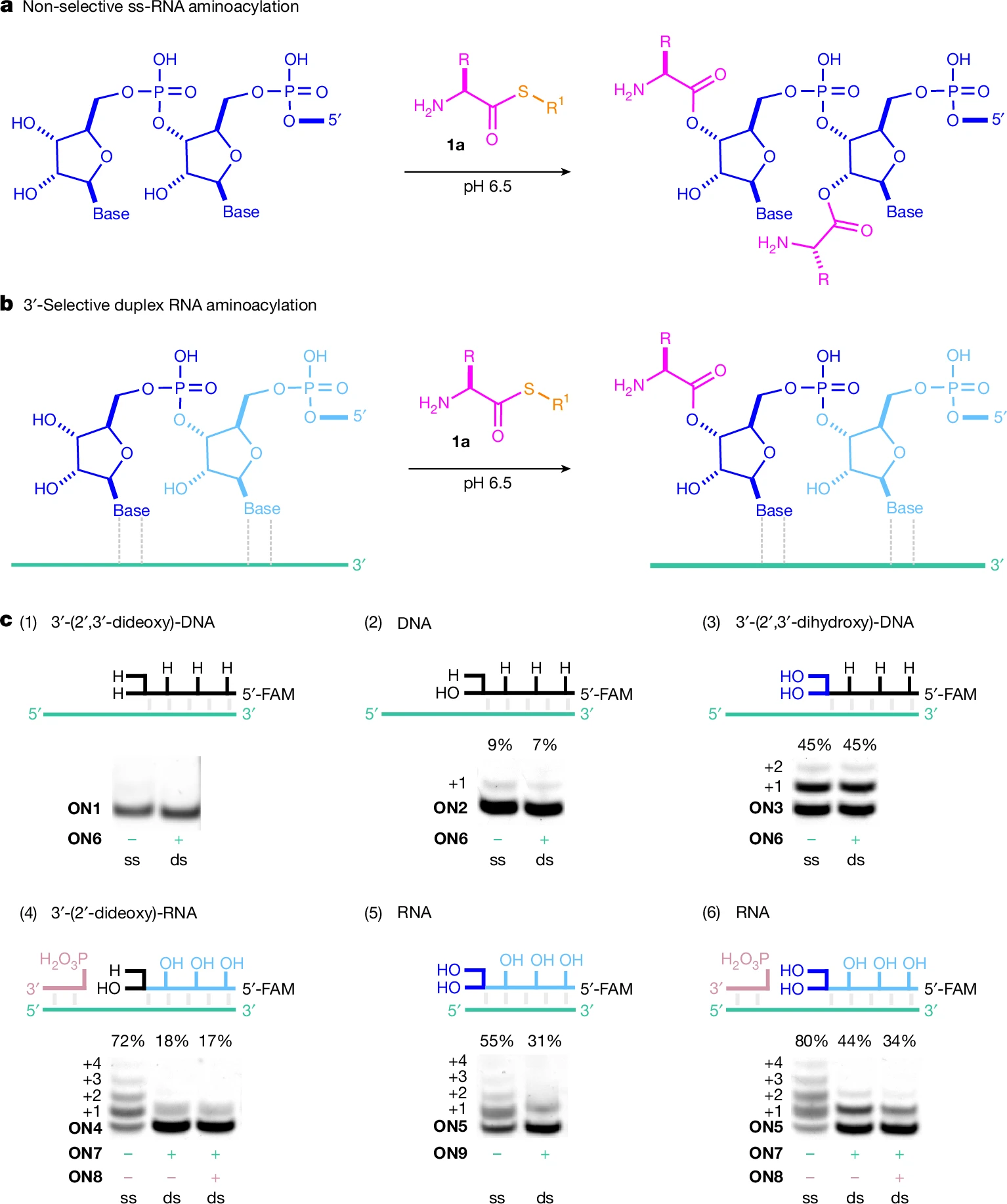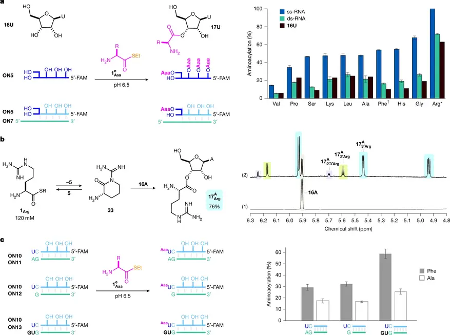 Во-первых, они избирательно присоединяют свою аминокислоту к правильному месту на молекуле РНК — так называемой 2', 3'-диоловой группе на её конце. Это именно то место, куда современные ферменты «грузят» аминокислоты.
