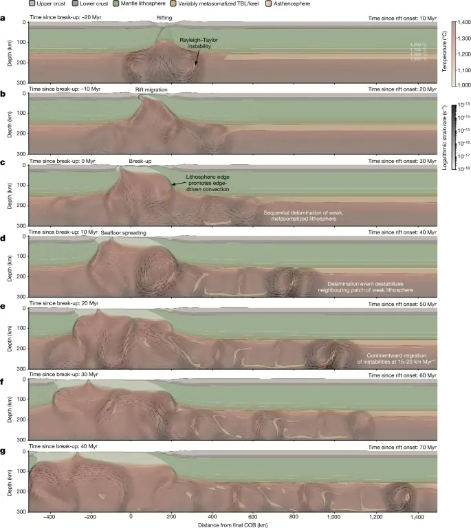 Когда «мантийная волна» достигает корней континента, она вызывает комплекс сложных процессов. Горячая мантийная материя, поднимаясь вверх, вступает в контакт с холодными породами континентальной литосферы. Это приводит к охлаждению и уплотнению мантии, которая начинает «тянуть» за собой нижние слои континентальной коры.