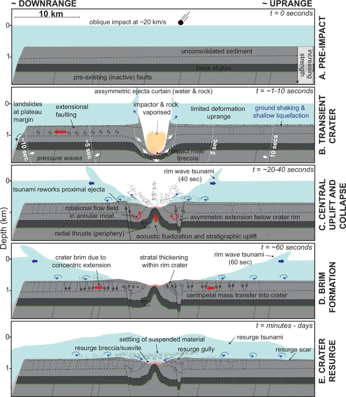 Анализ геометрии радиальных надвигов в кратере позволил предположить, что ударник двигался с востока под небольшим углом. Эта гипотеза подтверждается наличием «защищенной зоны» на востоке от кратера, где деформации минимальны. Удар также привел к образованию мощного цунами, следы которого обнаружены на расстоянии до 20 км от кратера.