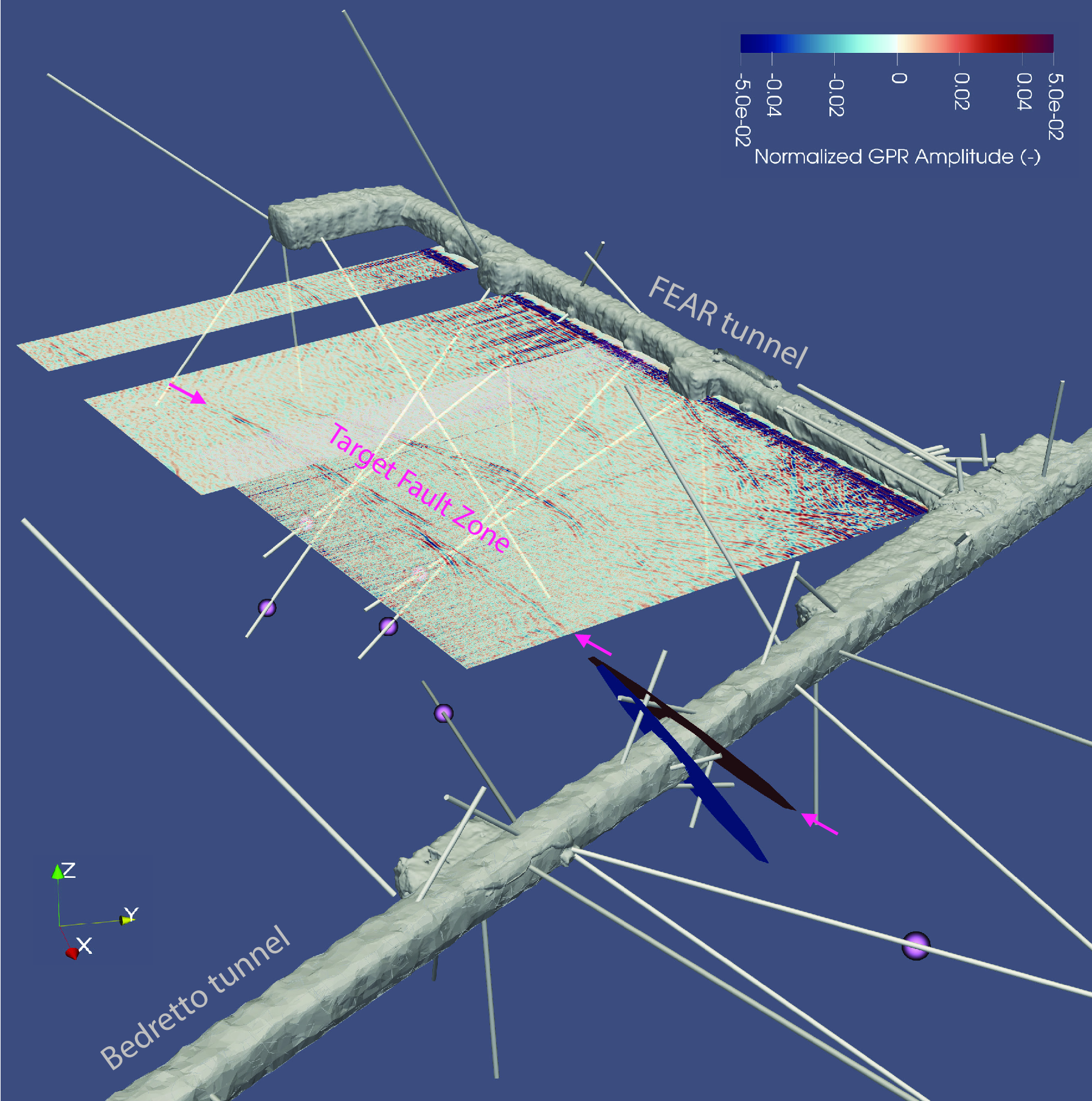 В ходе масштабных геологических изысканий ученые обнаружили целевую структуру — так называемый разлом MC. Это круто падающая зона шириной около двух метров, состоящая из множества пересекающихся трещин, заполненных мелкодисперсной раздробленной породой. Этот разлом находится в состоянии субкритического напряжения: тектонические силы уже давят на него, но естественного трения между блоками гранита пока хватает, чтобы удерживать их на месте.