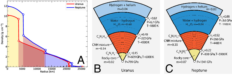 Результаты компьютерного моделирования позволили ученым построить новую модель внутреннего строения Урана и Нептуна. Согласно этой модели, обе планеты обладают относительно небольшим каменистым ядром: Уран — размером с Меркурий, а Нептун — с Марс. Над ядром располагаются слои несмешивающихся жидкостей — воды, метана и аммиака, разделенные слоем сжатого водорода. Именно отсутствие конвекции в этих слоях и объясняет слабость и хаотичность магнитных полей ледяных гигантов.