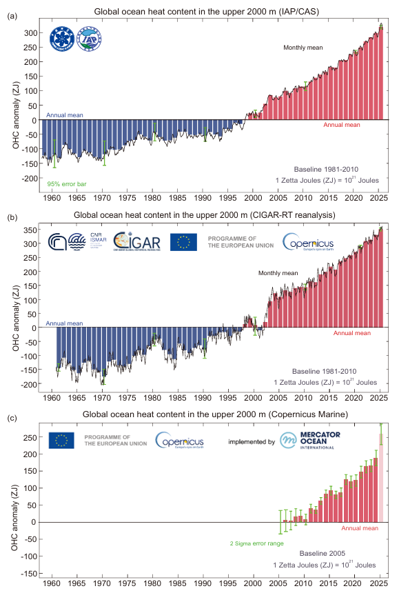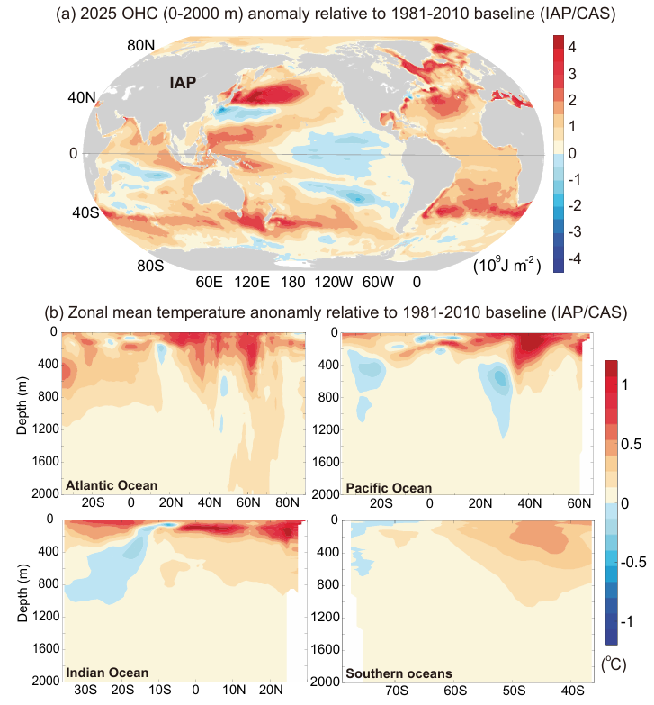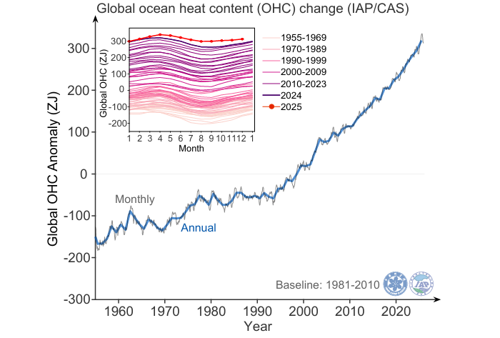 Согласно отчету, теплосодержание верхнего слоя океана (0-2000 метров) в 2025 году увеличилось примерно на 23 Зеттаджоуля (ЗДж) относительно уровня 2024 года. Один зеттаджоуль равен 1021 джоулей.