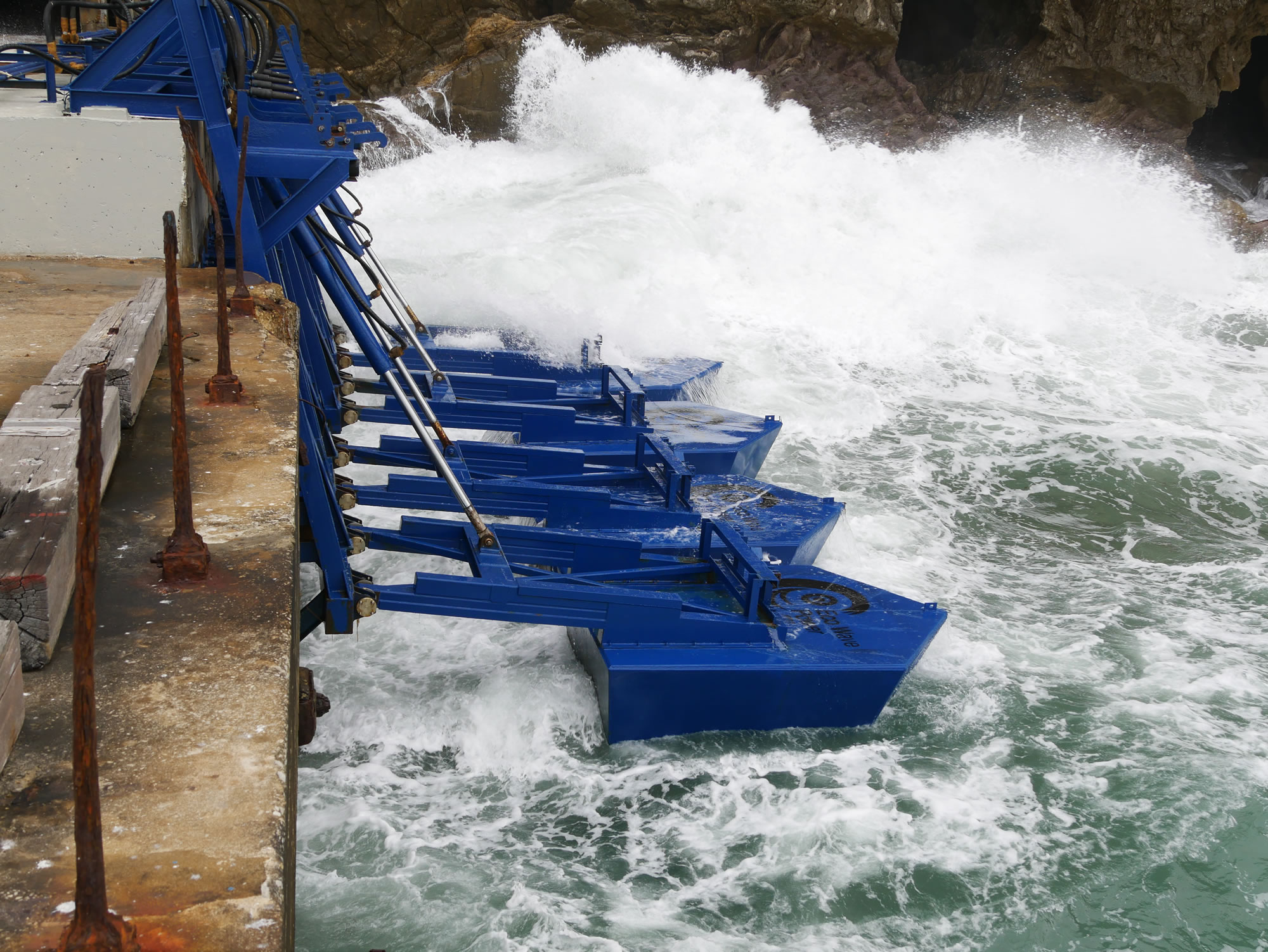 Пилотная установка включает восемь волновых энергетических платформ, закрепленных на существующем бетонном пирсе. Оборудование для преобразования энергии размещено в двух 20-футовых морских контейнерах.