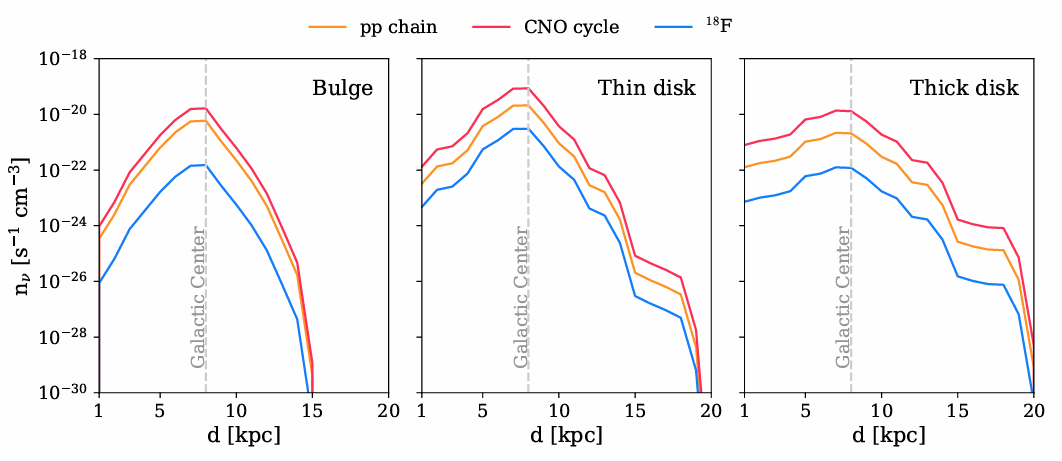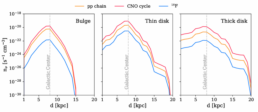 Основной вклад в высокоэнергетическую часть спектра вносят реакции ядерного синтеза, при которых водород превращается в гелий. На Солнце этот процесс идет преимущественно через протон-протонный цикл. Однако в масштабах всей Галактики, особенно в Тонком диске, существенную роль начинают играть массивные звезды. В их недрах температура и давление настолько высоки, что доминирует CNO-цикл (углеродно-азотно-кислородный цикл).
