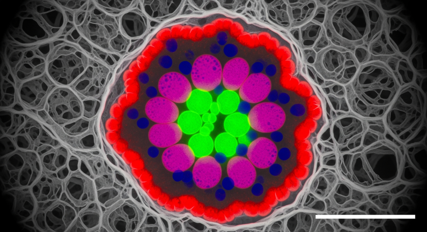 - Физическое усилие: Одновременно он начинает тянуть и толкать окружающий его матрикс — плотную сеть из коллагеновых волокон (это тот же прочный белок, из которого состоят наши сухожилия). Эмбрион активно перестраивает пространство вокруг себя, буквально расчищая себе путь.