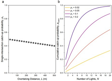 Чем больше расстояние между светофорами, тем выше математическая вероятность того, что на пути быстрого автомобиля возникнет новая помеха — другая медленная машина, выезжающая с прилегающей территории. Как только быстрый автомобиль вынуждают сбросить скорость из-за нового препятствия, его изначальное временное преимущество перед первым медленным автомобилем начинает стремительно таять еще до подъезда к светофору.