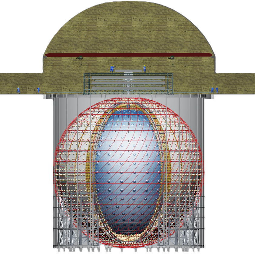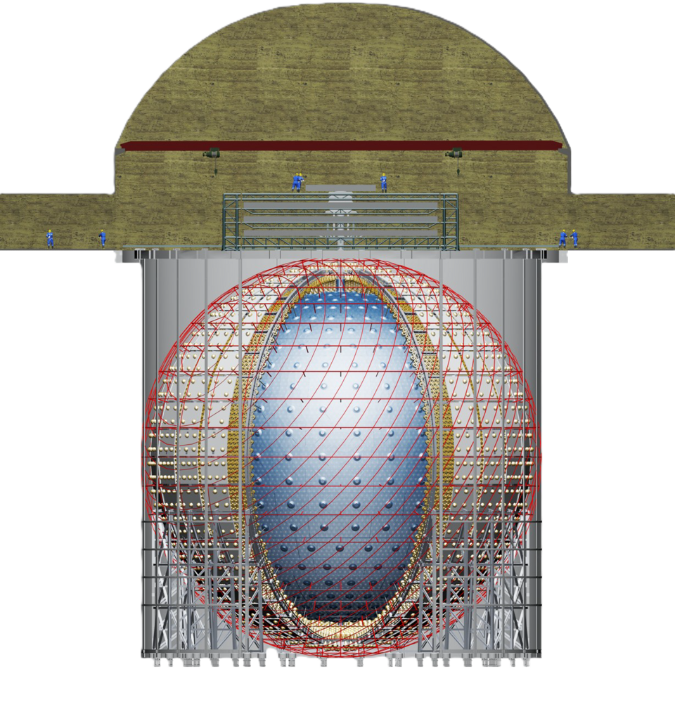 Детектор представляет собой сферу диаметром 35 метров, размещённую в скальной породе на глубине 700 метров. Внутри сферы находится 20 000 метрических тонн жидкого сцинтиллятора — вещества, излучающего свет при взаимодействии с нейтрино. Стенки оборудованы 43 212 фотоумножителями, каждый из которых регистрирует отдельные световые частицы. Детектор окружён резервуаром со сверхчистой водой, защищающей измерения от космических мюонов и других фоновых частиц.