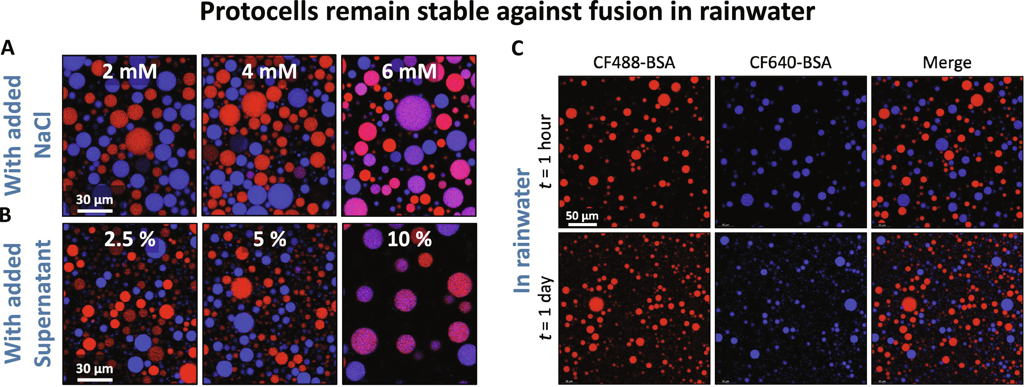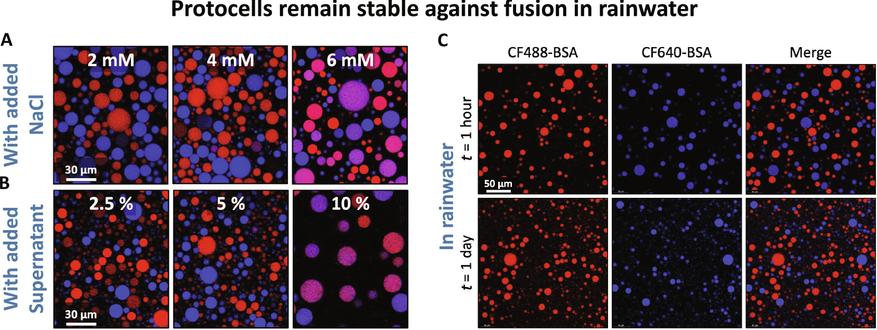 Ученые предположили, что дождевая вода, являясь естественным источником деионизированной воды, могла играть аналогичную роль на ранней Земле. Эксперименты подтвердили эту гипотезу: дождевая вода действительно стабилизирует коацерваты, предотвращая их слияние и утечку РНК.
