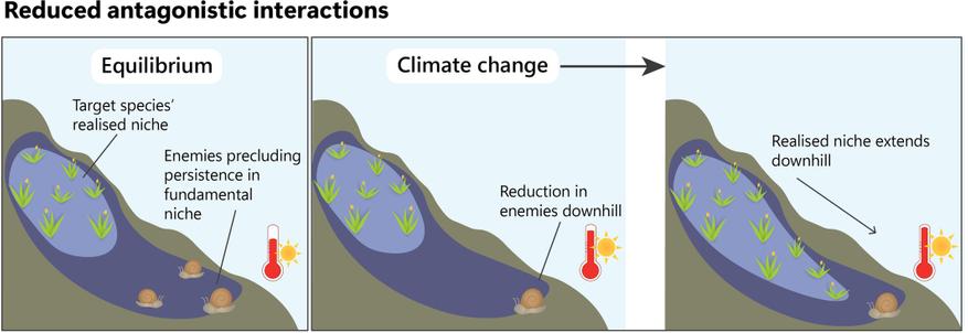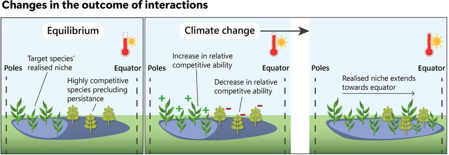 - Правила меняются. Иногда отношения, которые были вредными, вдруг становятся нейтральными или даже полезными. Например, два вида растений конкурировали за воду и солнечный свет. Из-за потепления один из них, более чувствительный к засухе, начинает чахнуть и отступать. Для второго вида это настоящий подарок: конкурент исчезает, освобождая ресурсы. В итоге он не только не страдает от жары, но и начинает процветать на территории, где раньше ему было тесно.