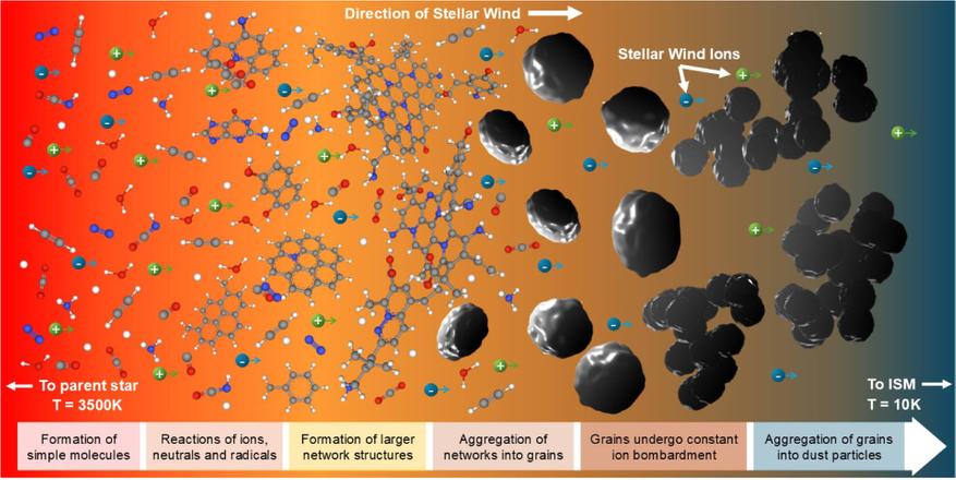 Для начала нужно лучше понять химию космической пыли. Первичная материя, выбрасываемая умирающими звездами (в частности, звездами асимптотической ветви гигантов), богата алифатическими соединениями — цепочками углерода и водорода.