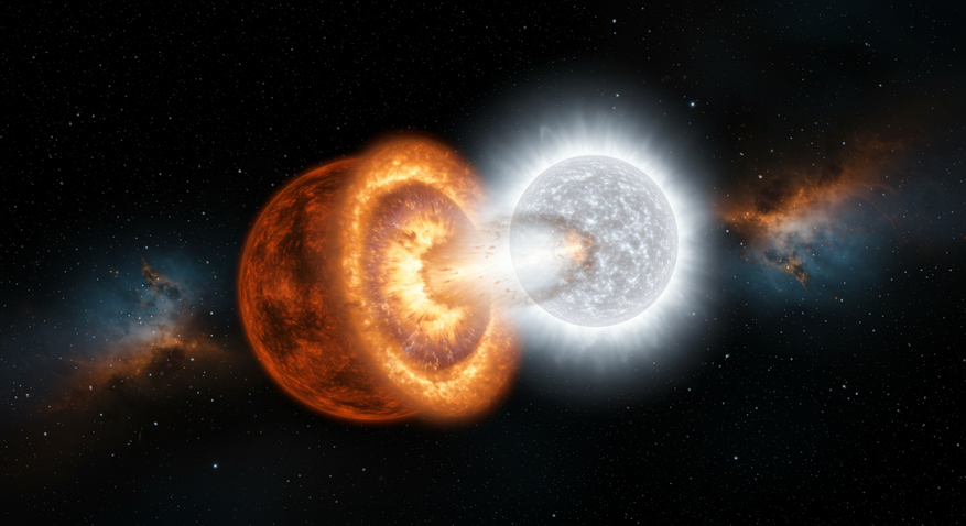 Белый карлик — это звезда, исчерпавшая ядерное топливо и больше не поддерживающая термоядерные реакции. В двойной звёздной системе он может притягивать вещество от звезды-компаньона, обычно красного гиганта. Традиционно считается, что белый карлик взрывается, только когда его масса достигает предела Чандрасекара — около 1,4 массы Солнца. Но двойная детонация начинается раньше. На поверхности карлика накапливается слой гелия, который под давлением воспламеняется, вызывая первый взрыв. Этот взрыв порождает ударную волну, которая сжимает ядро звезды и запускает второй, более мощный термоядерный взрыв, уничтожающий её полностью.