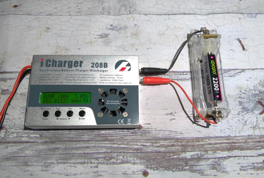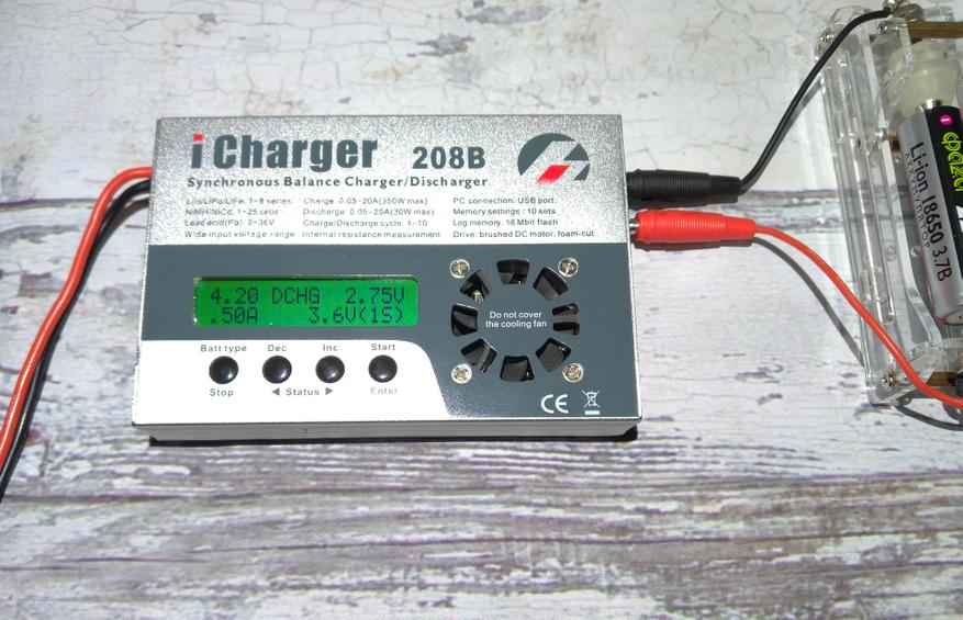 Для замера реальной емкости воспользуемся фирменным зарядно-балансировочным устройством iCharger 208B. Параметры замера стандартные, т.е. ток разряда 0,2С (С — емкость), что при заявленной емкости составляет около 440ma. Я установил ток разряда 0,5А, предел разряда 2,75V: