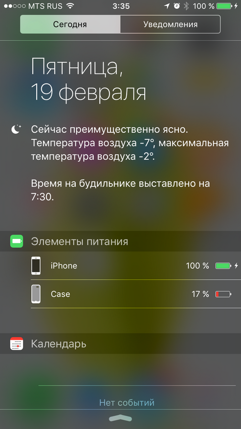 Схема простая: сначала заряжается сам смартфон до 100%, затем — чехол до 100%. А процесс разрядки происходит наоборот: сначала полностью разряжается чехол, а затем начинает разряжаться смартфон. В выдвигаемом сверху меню «Сегодня» всегда можно посмотреть оставшийся заряд чехла и смартфона. Оба значения указаны под заголовком «Элементы питания». Кроме того, при подключении зарядного устройства на экране блокировки отображается процент заряда по каждой батарее.