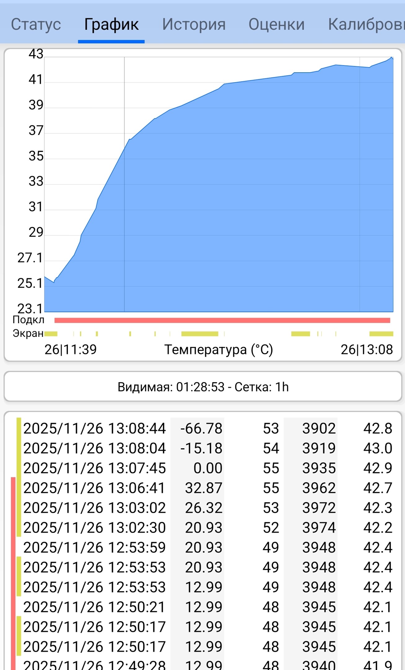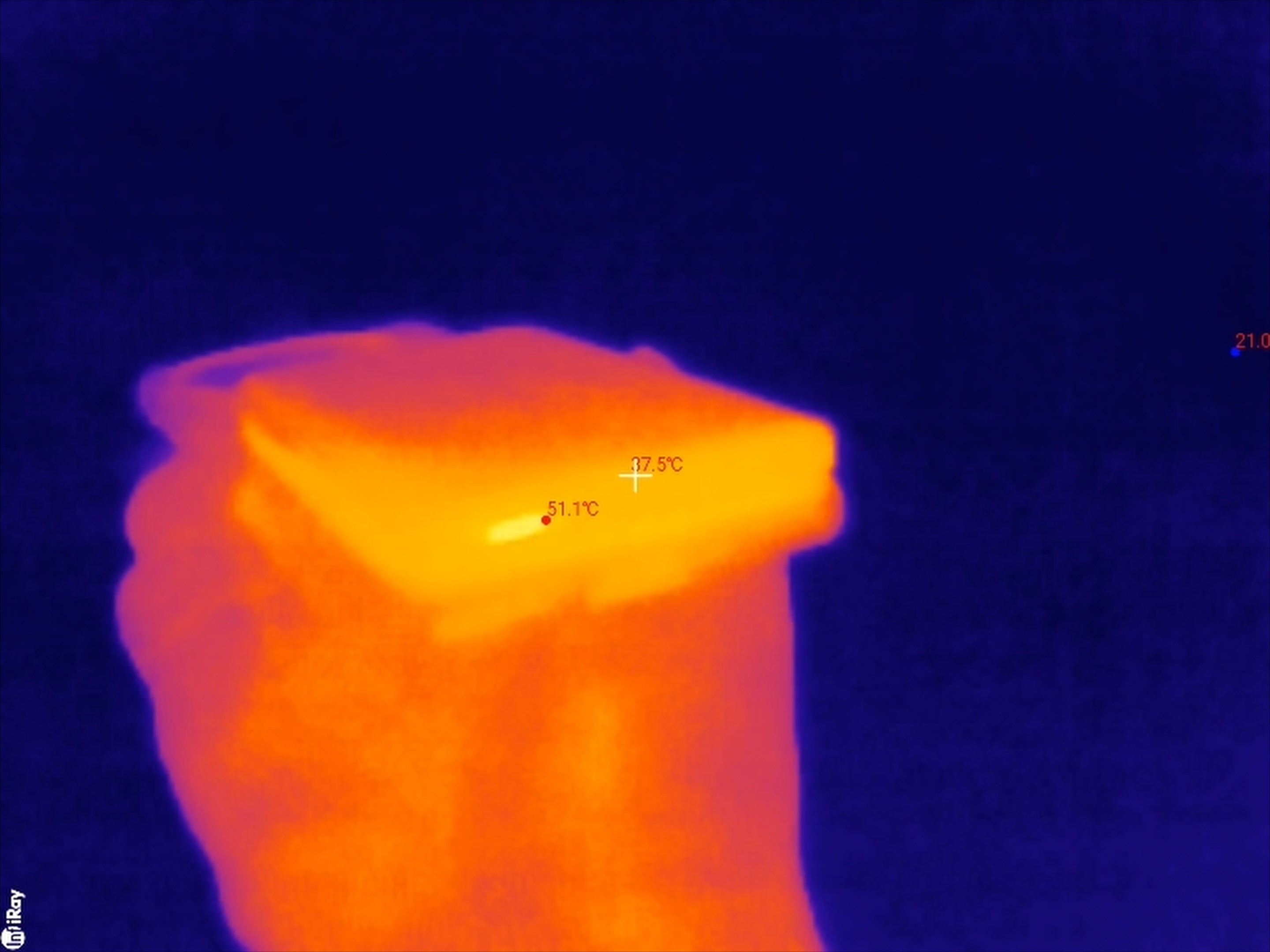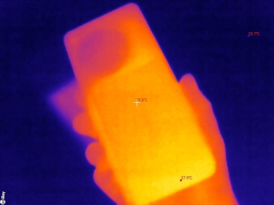 Смартфон также нагревается сам по себе в процессе зарядки. В частности, его преобразователь и аккумулятор, встроенная катушка добавляют тепла, к этому ещё и повербанк его греет. По корпусу смартфон нагревается до 35-36 градусов, а аккумулятор разогревается до 43 градусов. Дальнейшего нагрева не происходит, так как заряд повербанка на этом заканчивается.