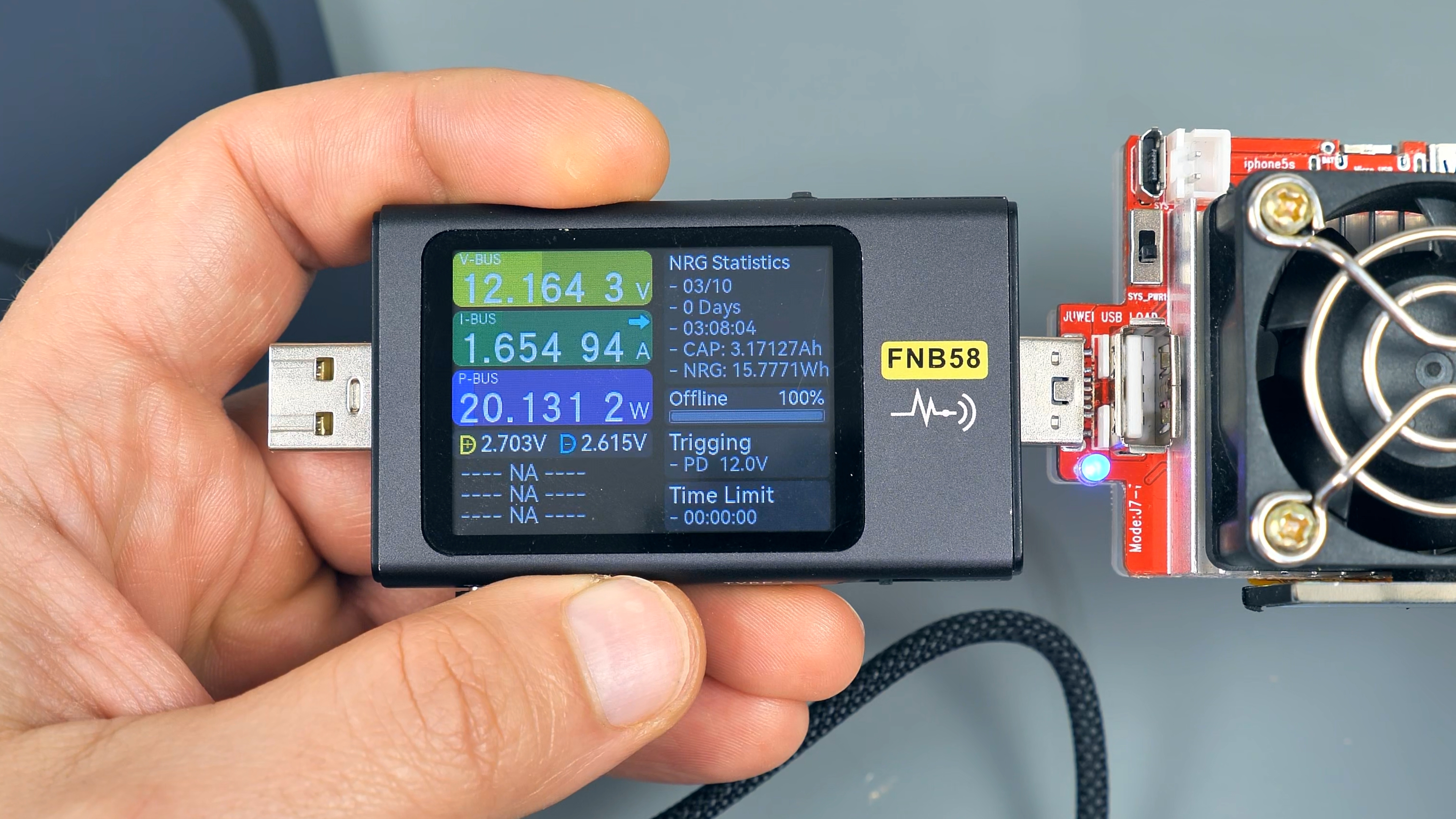 По завершении теста и полном разряде аккумулятора повербанк отключился. К счастью, тестер имеет энергонезависимую память, и после подключения внешнего питания можно увидеть последние зафиксированные значения. Тест длился без малого 3 часа, и было измерено 2955 мАч при заявленных 5000 мАч. Эти значения не должны совпадать из-за разницы в напряжении. Также зафиксировано 14,45 Вт·ч против заявленных производителем 18 Вт·ч — эти показатели должны быть ближе друг к другу. Однако, как видно, они существенно различаются. На основании этого можно сделать вывод, что реальная ёмкость повербанка на 20% ниже заявленной: не 18, а 14,5 Вт·ч. Можно было бы списать потери на нагрев преобразователя, но 20% — это слишком много для подобных потерь.