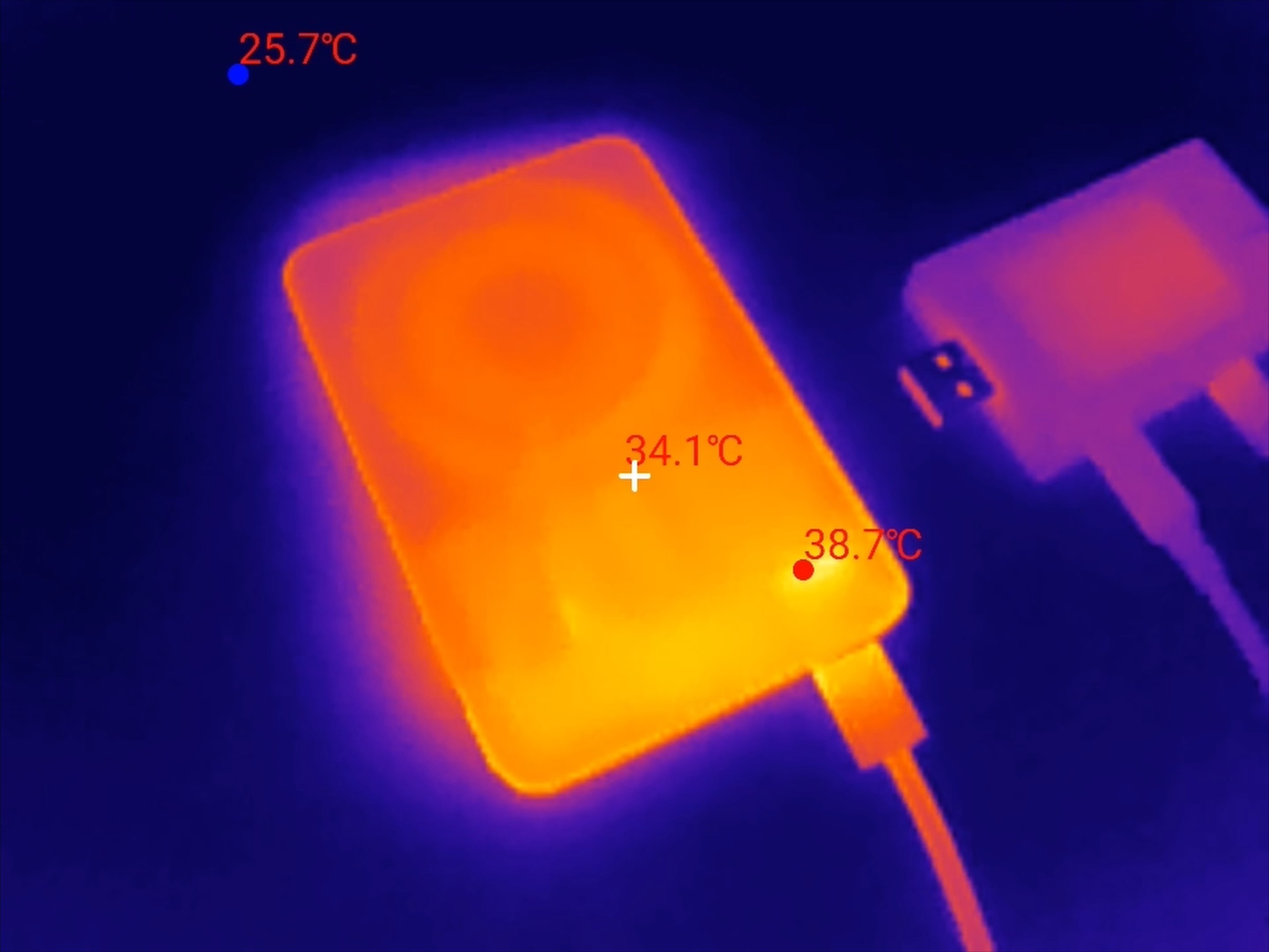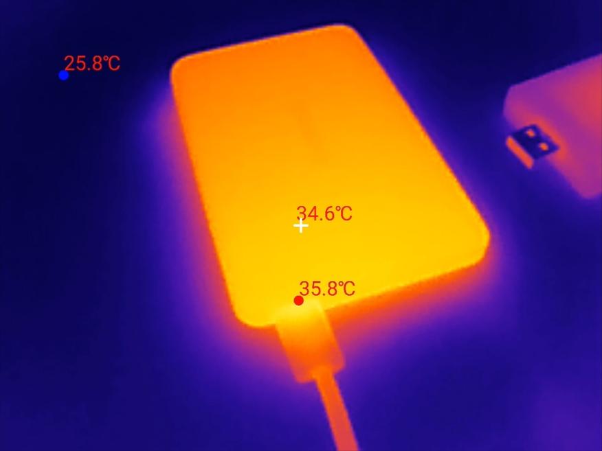 Однако повербанк при разряде практически не нагревается, особенно при работе на пониженной мощности. Даже при его зарядке с использованием быстрой зарядки мощностью 15 Вт устройство нагревается незначительно. Максимально зафиксированная температура в области преобразователя не достигает 39 градусов.