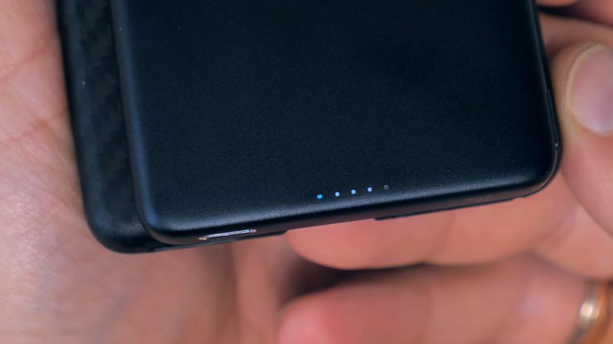 И, конечно же, сам повербанк. Внешняя часть корпуса выполнена из алюминия с устойчивым к царапинам покрытием. На лицевой стороне расположен индикатор уровня заряда аккумулятора и логотип производителя. На внутренней стороне, под мягким софт-тач покрытием, размещены магнитное крепление и катушка с поддержкой стандарта беспроводной зарядки Qi.