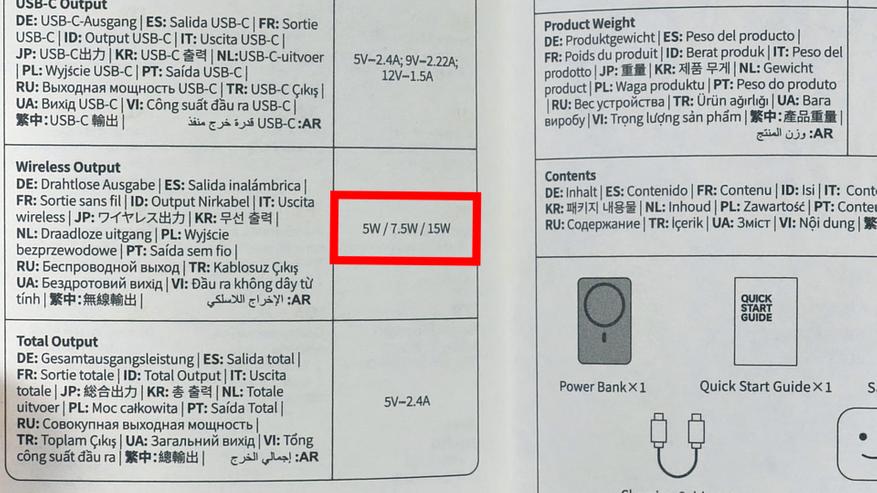 Производитель указывает, что беспроводной модуль повербанка поддерживает три уровня мощности: 5 Вт, 7,5 Вт и 15 Вт.