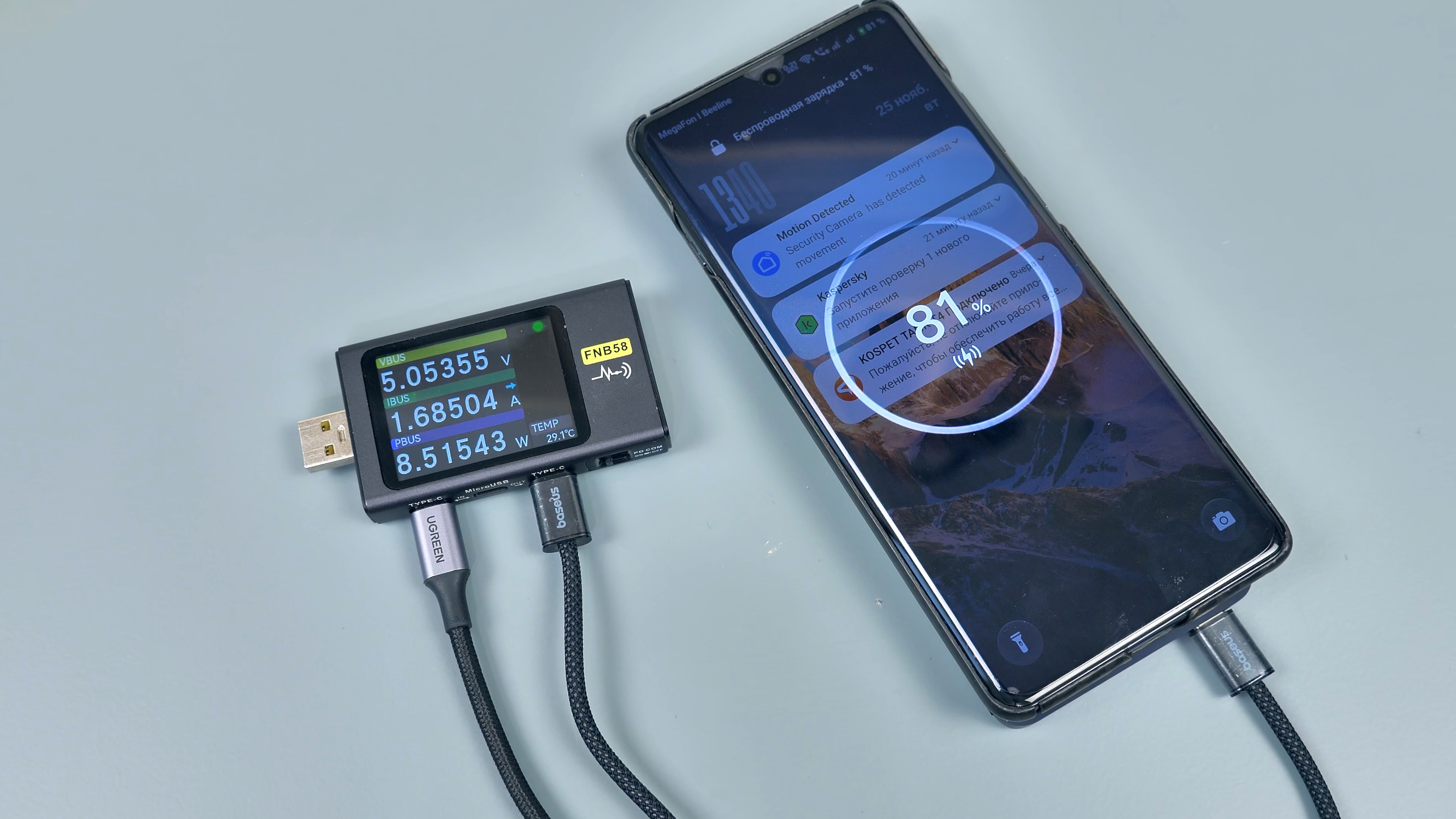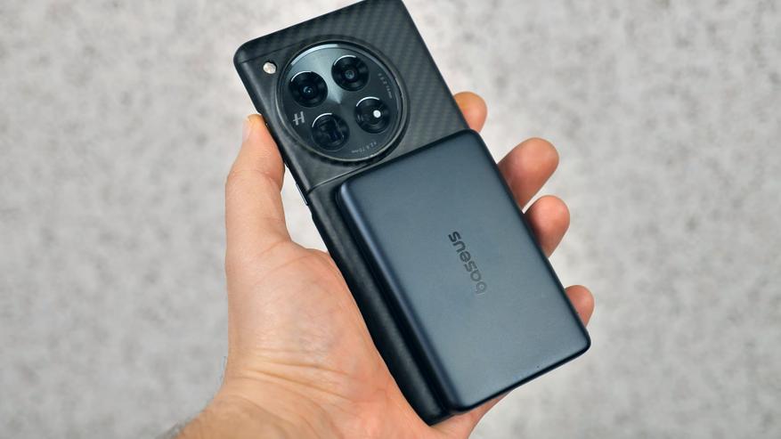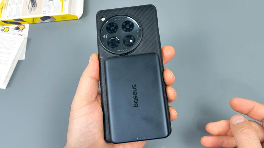 Аккумулятор смартфона OnePlus 12 ёмкостью 5000 мА·ч этот повербанк по беспроводу зарядил с 10% до 55%. Таким образом, заряда повербанка хватает чуть менее чем на половину заряда смартфона с аккумулятором 5000 мА·ч. Весь процесс занял полтора часа.