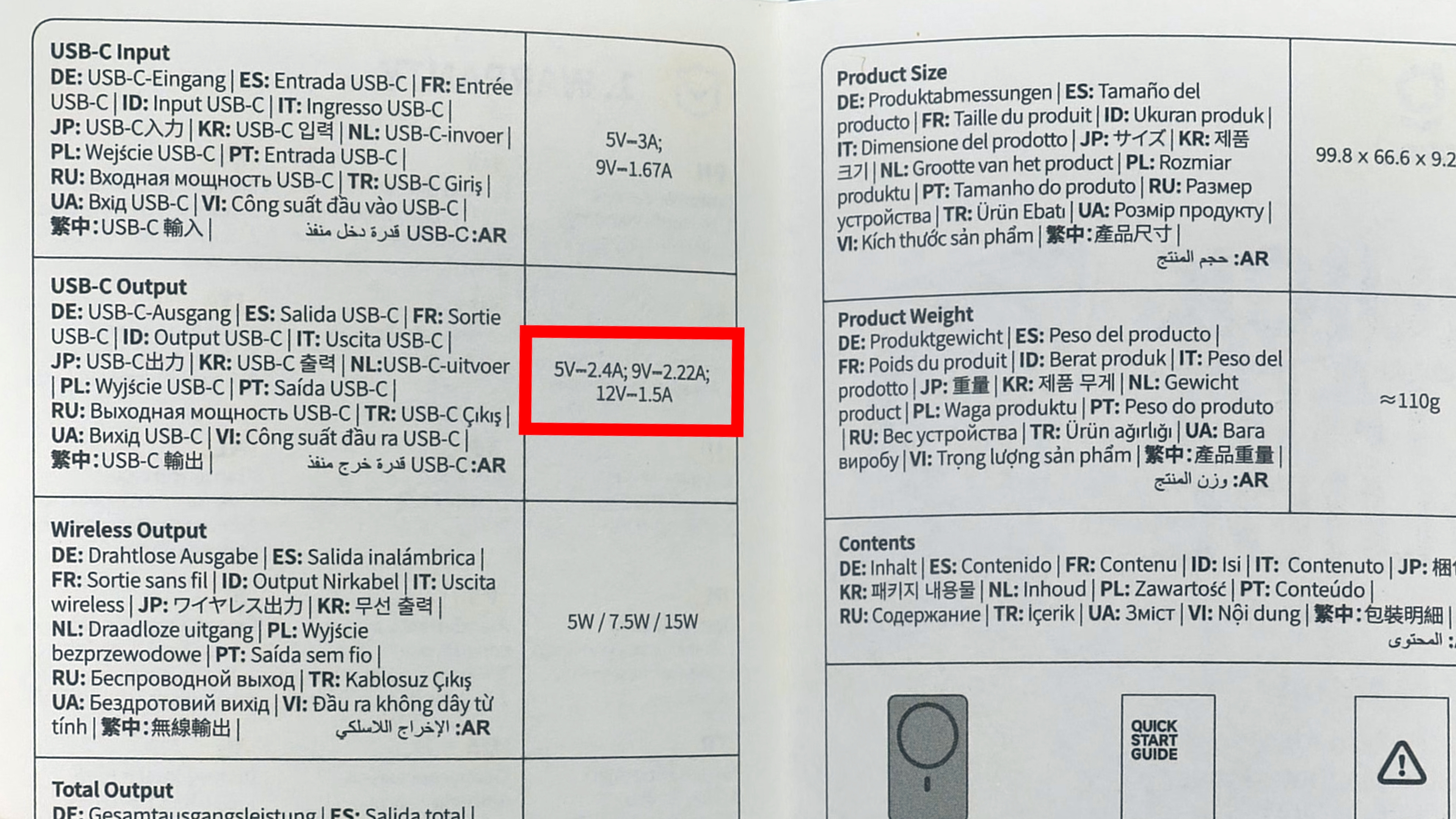 | Выход USB-C | 5В = 2,4А / 9В = 2,22А / 12В = 1,5А |