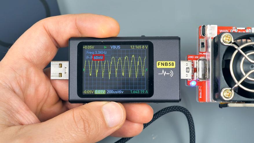 При напряжении 12 вольт в режиме Power Delivery порт способен выдавать полную заявленную мощность 20 ватт. Уровень пульсаций в этом режиме составляет 60 мВ, что при напряжении 12В соответствует 0,5% — это существенно ниже максимально допустимого диапазона 2-5%. Показатели пульсаций находятся в пределах нормы, за подключаемые устройства можно не переживать.
