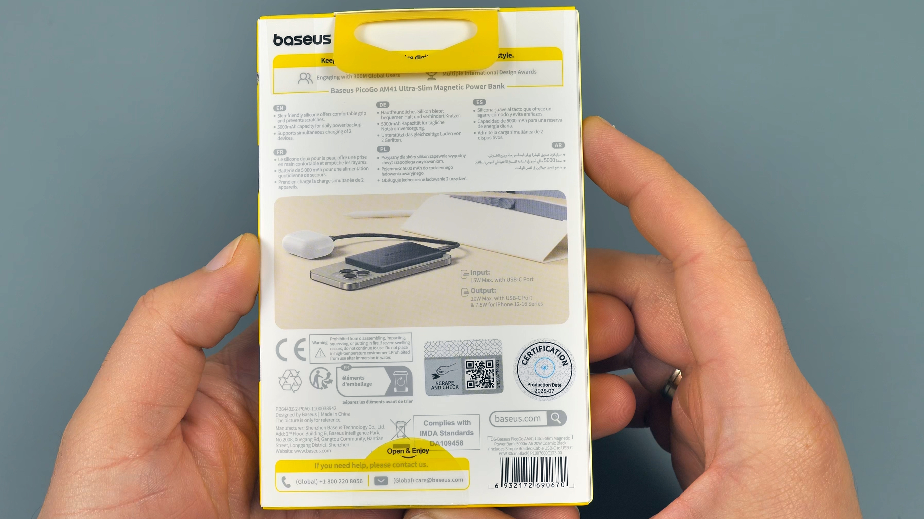 Повербанк поставляется в компактной фирменной упаковке, на обратной стороне которой расположен скретч-код для проверки подлинности устройства.