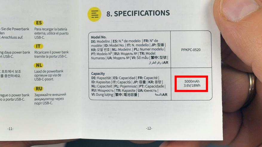 Ёмкость встроенного аккумулятора повербанка, заявленная производителем (5000 мА·ч при напряжении 3,6 В), не может корректно сравниваться с показателями, измеренными через USB-порт (5 В), поскольку значения существенно различаются при разных напряжениях. Для точного сравнения энергоёмкости устройства необходимо использовать показатель энергетической ёмкости в ватт-часах (Вт·ч). Производитель указывает значение 18 Вт·ч, которое остаётся неизменным независимо от используемого напряжения. Данный параметр является наиболее точным индикатором общей энергоёмкости устройства.