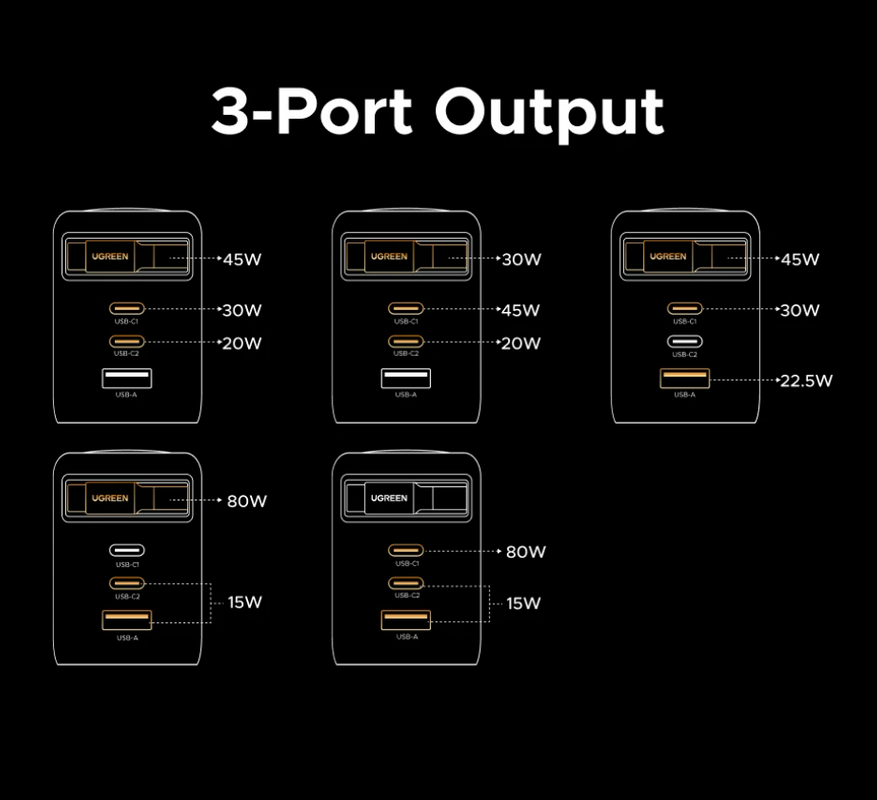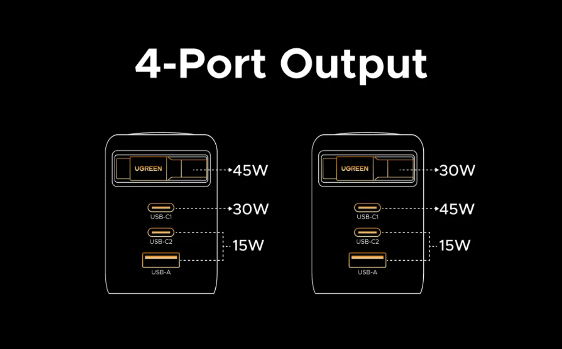 Также заявлена поддержка GaNInfinity и Thermal Guard. GaN Infinity — это фирменная технология Ugreen, основанная на усовершенствованных GaN-чипах (нитрид галлия). Она означает, что внутри стоит усовершенствованный модуль питания нового поколения, который обеспечивает более высокую энергоэффективность (меньше тепла при той же мощности). Также это означает более компактный размер по сравнению с обычными зарядками на кремнии. Что касается Thermal Guard, то даже по названию ясно, что речь о защите от перегрева (реализованно с помощью регулировки мощности).