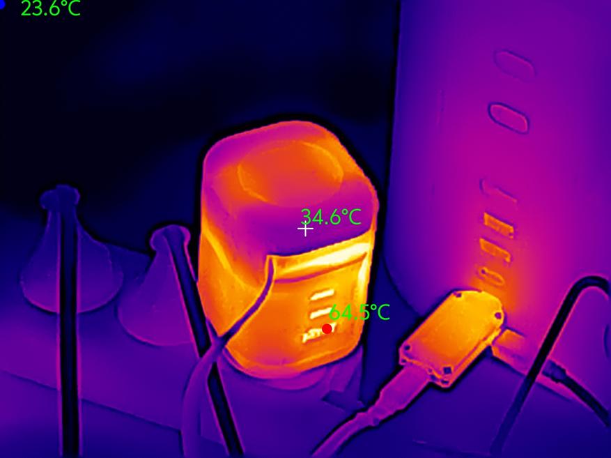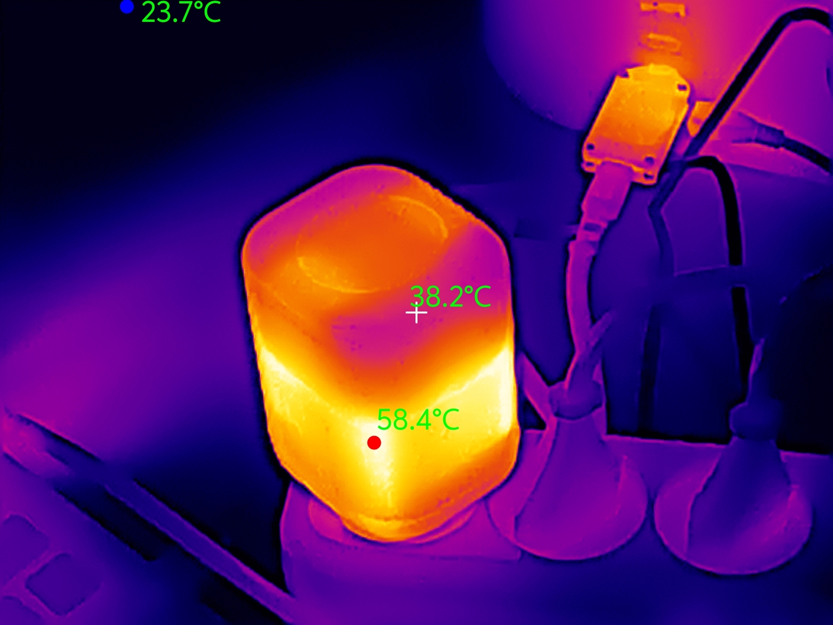 Ну и собственно вот так выглядит зарядка при максимальном нагреве на снимках тепловизора. Видно, что наиболее высокая температура в нижней части. Логично, учитывая то, что в верхней части просто катушка с кабелем. Корпус нагревается до 60 градусов, в районе USB разъемов — 65 градусов.