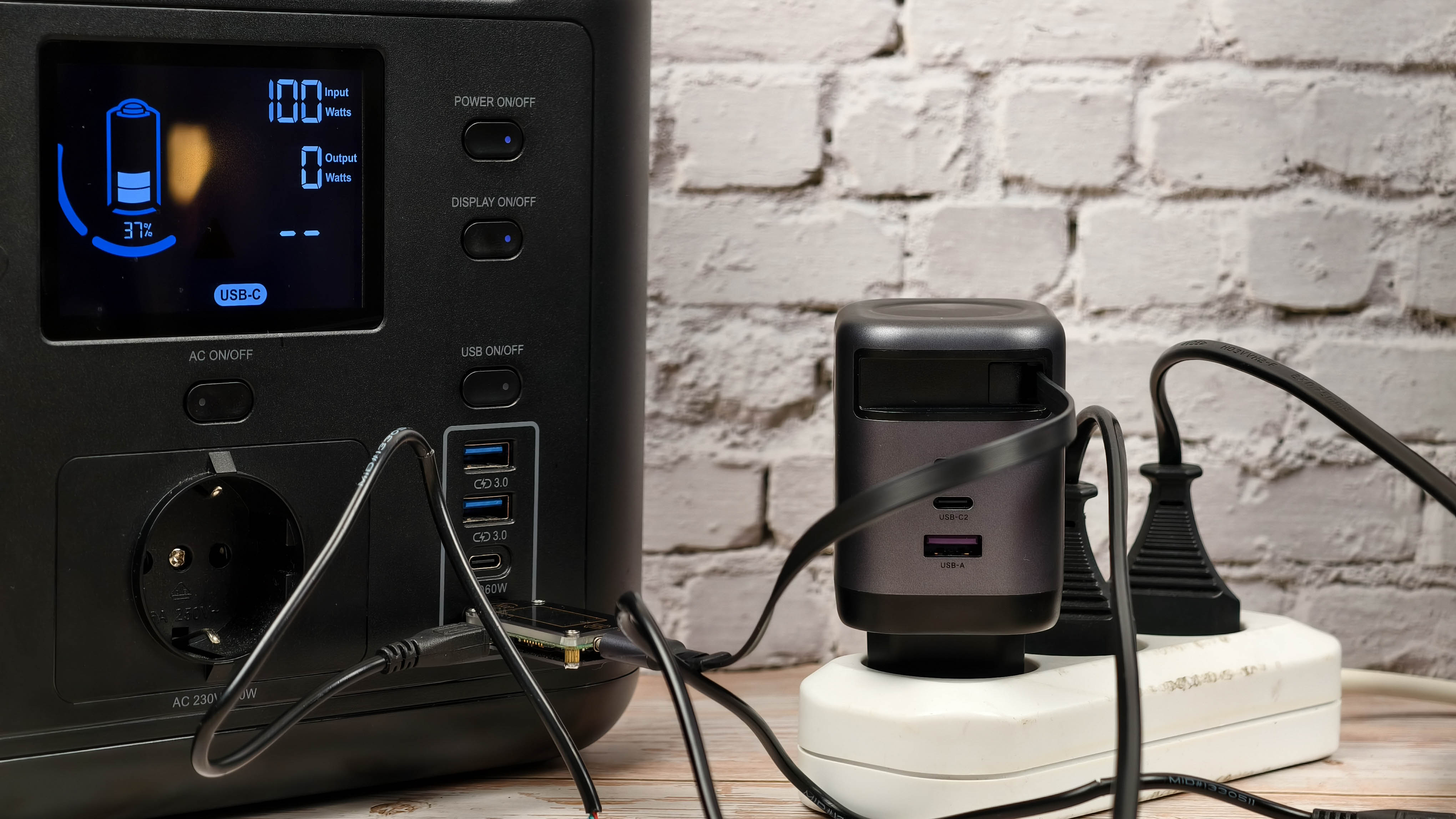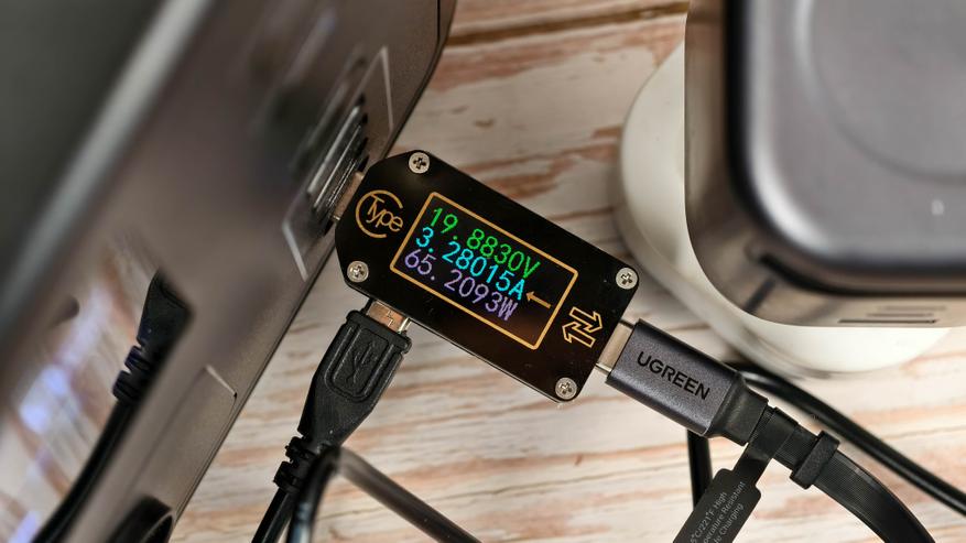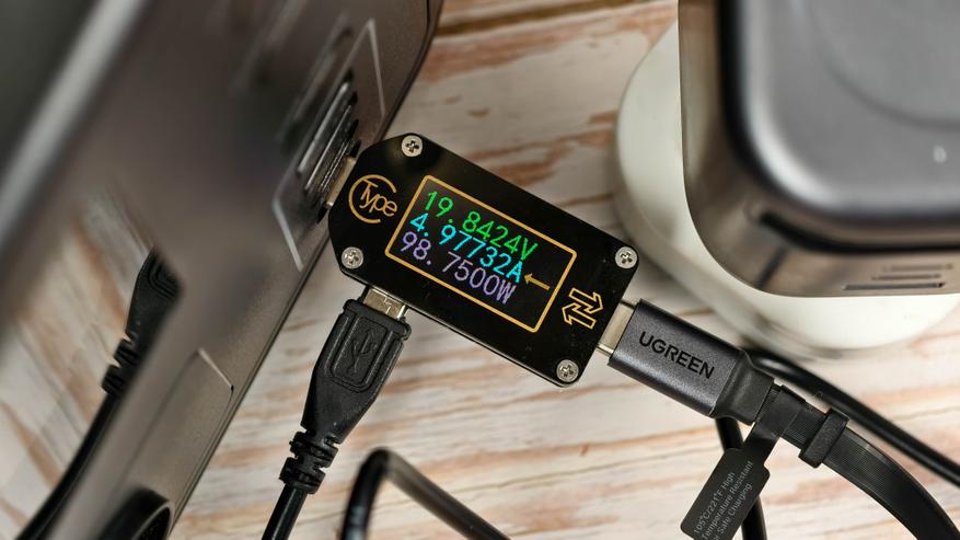 Далее проверил максимальную мощность. У меня в использовании есть портативная электростанция, которая при зарядке через USB-C берет 100W. Информационный экран на станции это подтверждает (Input 100W).