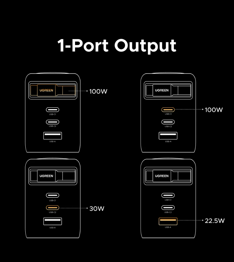 При работе зарядки используется умное распределение мощности между подключёнными гаджетами, собственно в инструкции можно найти и ознакомиться со схемами, которые применяются при зарядке нескольких устройств одновременно. Допустим вы заряжаете портативную электростанцию от встроенного кабеля, на который выдается мощность до 100W и хотите дополнительно подключить смартфон на зарядку через USB-C 1. При подключении смартфона происходите переключение режимов и теперь на кабель выдается 65W, в то время как на смартфон выделяется 30W. Как блок питания вы конечно сможете использовать эту зарядку, но если захотите подключить что-то дополнительно (или отключить), то питание естественно кратковременно пропадет.
