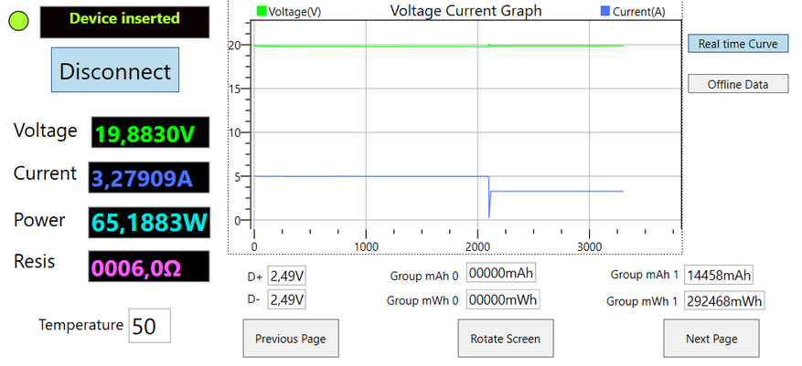 На тестере теперь 65W (19,88V и 3,28А).