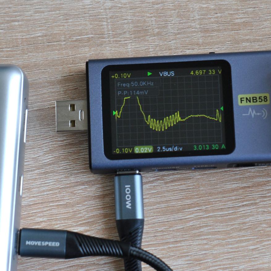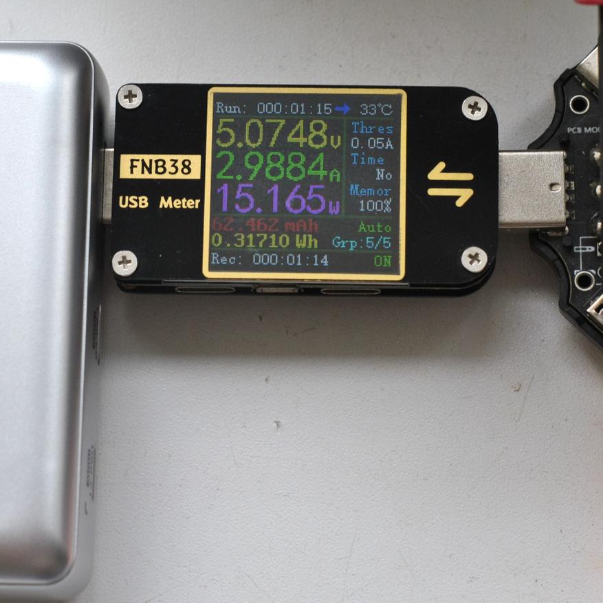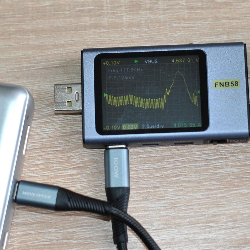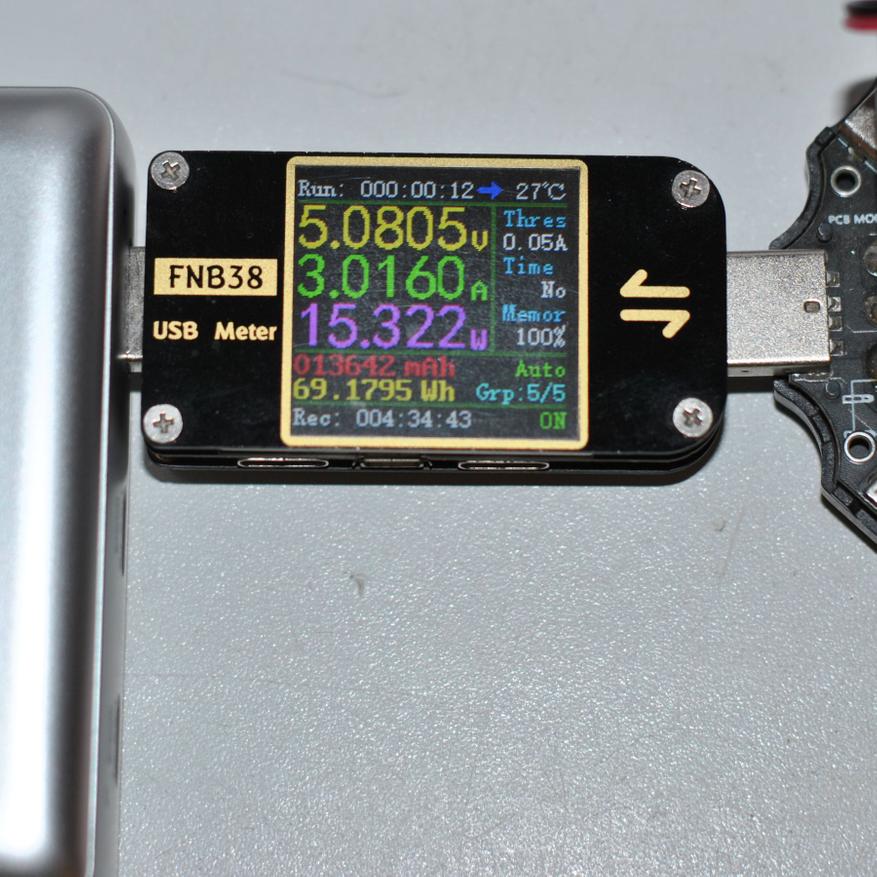 Проверим возможности всех трех портов с помощью точного USB тестера и регулируемой нагрузки. Для каждого порта посмотрим тест протоколов быстрой зарядки, максимальный ток по 5 В и пульсации на максимальном токе. Лоя портов USB-C задействуем комплектный кабель.