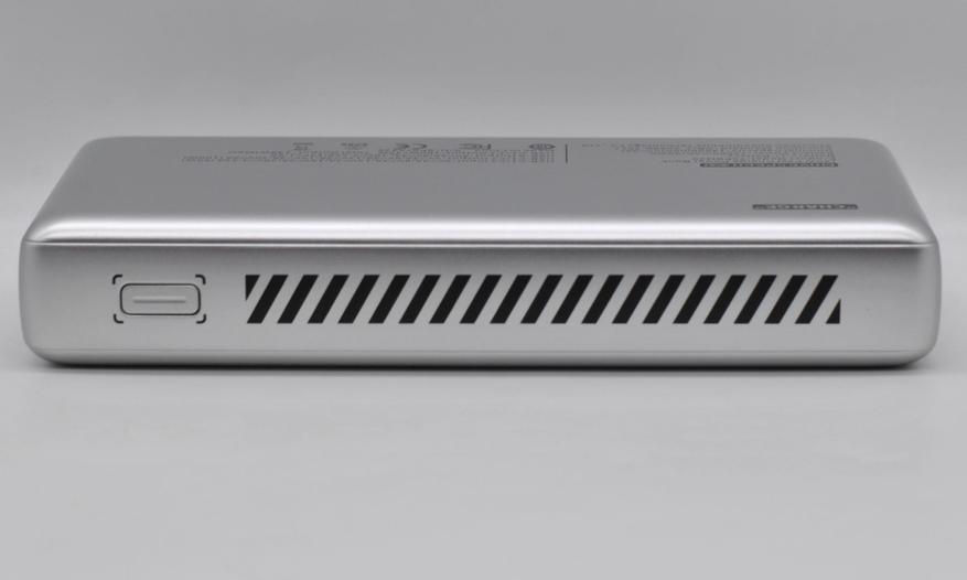 Форма корпуса классическая. А вот дизайн несколько аляповатый, много надписей. Пластик гладкий и скользкий. Разъемы (два Type-C и USB-A c широкими контактами) размещены в торце, дисплей с реальным зеркальным эффектом (в дороге зеркало всегда может пригодится).