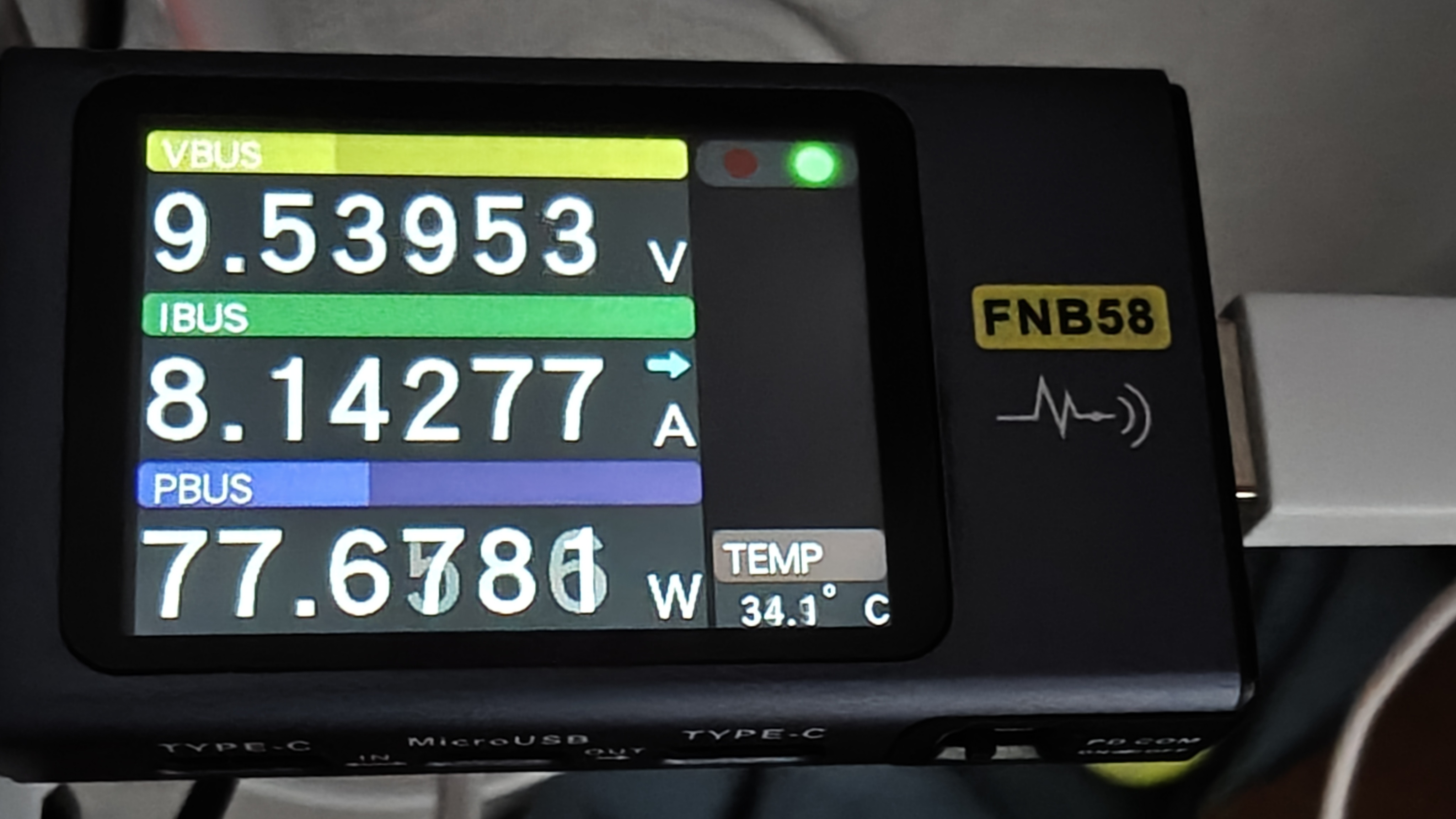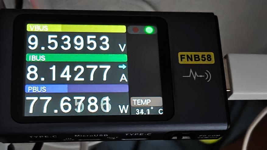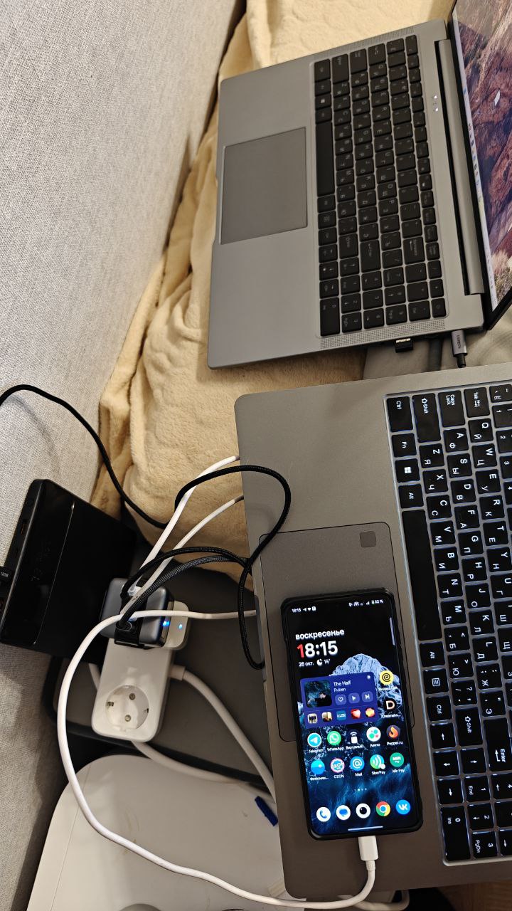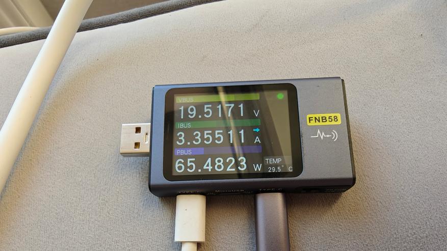 Блок уверенно заряжает смартфон и ноутбук, причём довольно быстро. Абсолютно не важно, какое устройство подключено к зарядке, она заряжает всё. Я подключил одновременно два ноутбука, смартфон и современный повербанк, максимально ваттметр показал 90 Вт электропотребления. Все устройства заряжались и не жаловались на недостаток мощности (обычно Windows выдает такие сообщения если есть нехватка мощности зарядки).