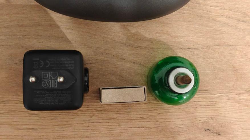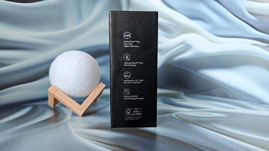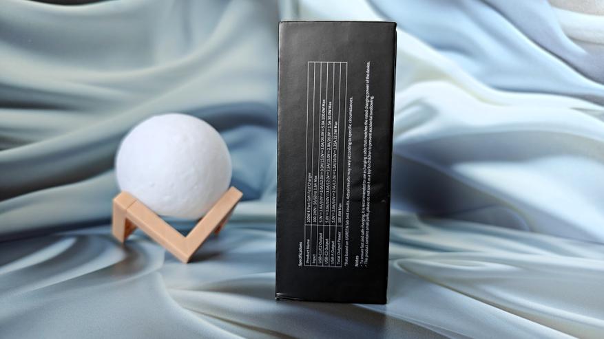 Приходит зарядка в компактной и крепкой, практически деревянной коробке, которая отлично спасает устройство при транспортировке. Внутри зарядка установлена в пластиковый блистер. Внешний вид нарисован на лицевой стороне, а параметры расписаны на торце коробки. Также мы можем найти информацию о производителе.