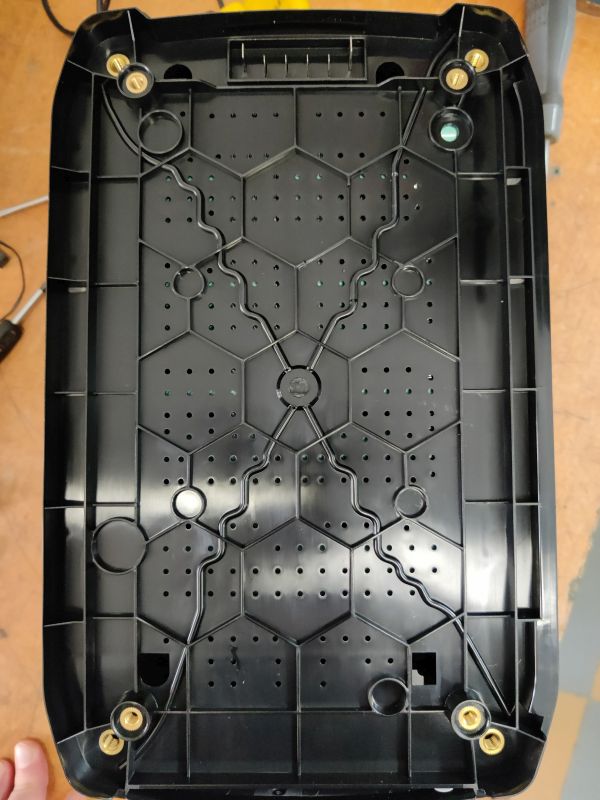 Любопытно было глянуть внутрь, потому прихватив парочку отверток, мы с товарищем это сделали. Вначале с ножек выкрутили четыре винтика внизу и увидели разъем для подсоединения доп. блока аккумов. Он ставится в разъем, а нижняя крышка на место. Что касается размеров станции, то они в результате таких манипуляций увеличиваются приблизительно на треть, а по емкости — в два раза. Батарей не видно, поскольку они закрываются вставкой из пластика. Остается верить изготовителю, что внутри таки