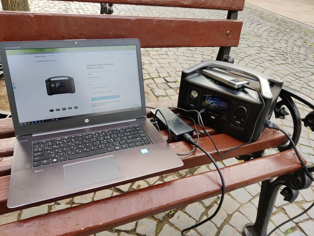 Данная модель является переносным источником питания, который имеет множество портов для различных устройств. На фото можно увидеть, как HP ZBOOK питается со стандартным зарядным устройством на 150 W и внешняя батарея в 30 W. Упустим момент постановочности данного кадра ввиду способности нынешних ноутов бесперебойно работать 6-10 часов и города с обилием розеток, суть в том, что можно иметь 220 В с 2-х розеток одновременно и до 600 Вт в сумме, находясь практически в любой точке любого населенного пункта.