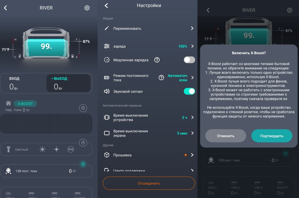 Присоединяю к смартфону и наблюдаю полный функционал приложухи для EcoFlow RIVER. Присоединение осуществляется после того, как установишь фирменную программу с апстора или плеймаркета. Там отображается статистика по уровню зарядки и работе, имеются также дополнительные возможности с виде тихой (более медленной) зарядки и буст для 1800 Вт.