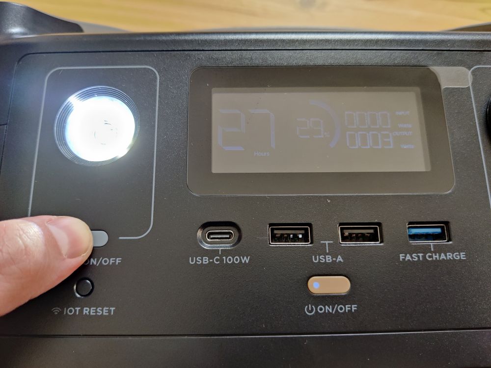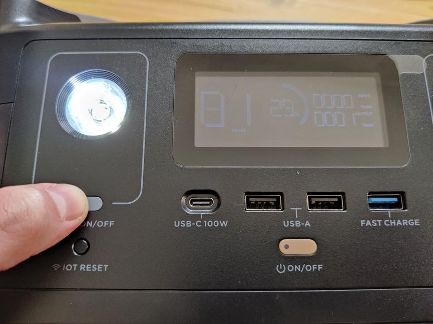 Спереди расположен экран, отображающий степень заряда, ожидаемое время работы, мощность зарядки или разрядки аккума. Имеется также разъем прикуривателя, два 12 Вт выхода, пара USB под 2,4 А и один, поддерживающий QC. Я уже писал о сожалениях о том, что type-c не поддерживает зарядку и лучше с таким же показателем в 100 Вт, как и может давать пользователям.