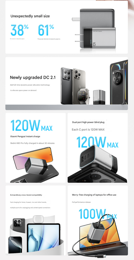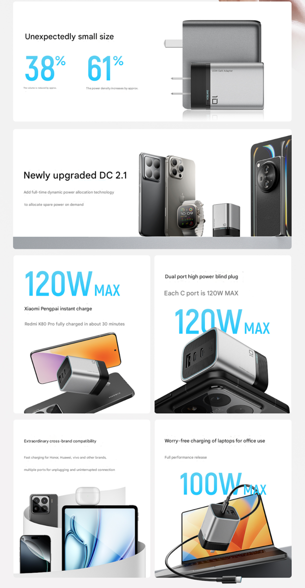 Новинка оснащена тремя портами: двумя USB Type-C и одним USB Type-A. При подключении одного устройства порты USB-C обеспечивают зарядку мощностью до 120 Вт, а порт Type-A — до 33 Вт. В случае одновременного использования всех трех портов мощность каждого USB Type-C снижается до 45 Вт, а Type-A — до 22,5 Вт.