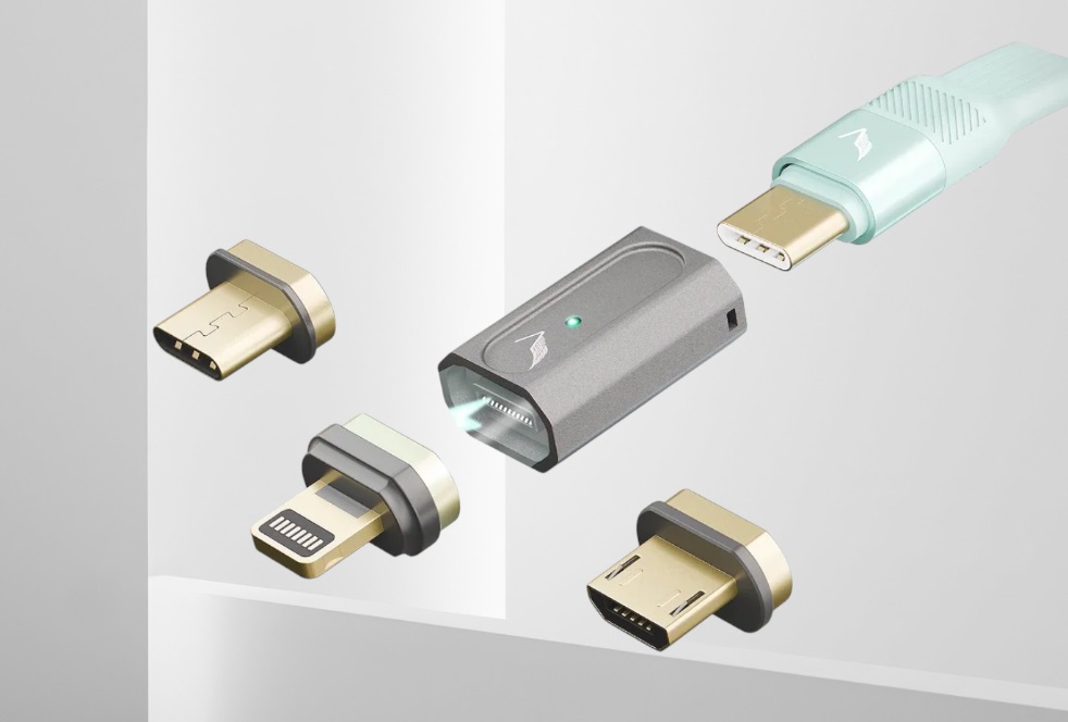 Кабель комплектуется сменными магнитными насадками для портов Lightning и microUSB, а также собственным коннектором USB-C, избавляя от необходимости его отсоединения при смене заряжаемого устройства.