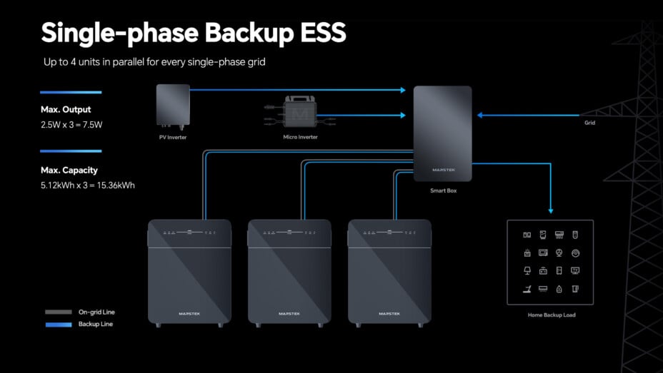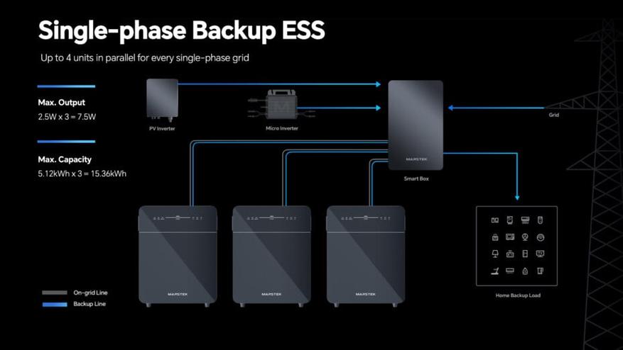 Ёмкость одной единицы составляет 5,12 кВт·ч. Используются литий-железо-фосфатные (LFP) элементы. Допускается параллельное подключение до трёх модулей (15 кВт·ч) или до девяти — в трёхфазной сети (46 кВт·ч). Максимальная мощность зарядки — 2,5 кВт. При подключении к электрощитку устройство отдаёт до 2,5 кВт, в конфигурации из трёх модулей — до 7,5 кВт в однофазной и 22,5 кВт в трёхфазной сети.